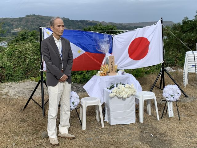 ルソン島北部の平野部での個別慰霊式で挨拶する筆者。この地での他の戦没者遺族はいなかったので私1人のための慰霊式となった。私の伯父は1941年12月8日真珠湾攻撃に呼応して日本軍の先遣部隊の1員として12月10日港町アパリに侵攻したあと斥候兵としてマニラへ南進する途中で交戦となり戦死した。上陸後12日目に命を落とし彼の青春もこの地で終えた。