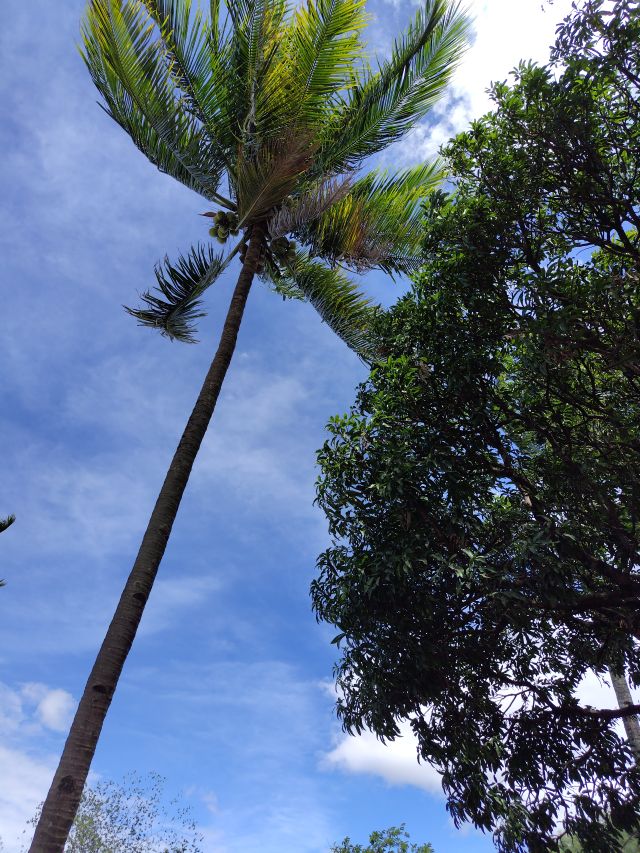 通常やしの木一本で1房に10個の実を3房つけるので計30個の実をつける。常夏なので年中実をつけ収穫すると別の房で実をつけるとの事。