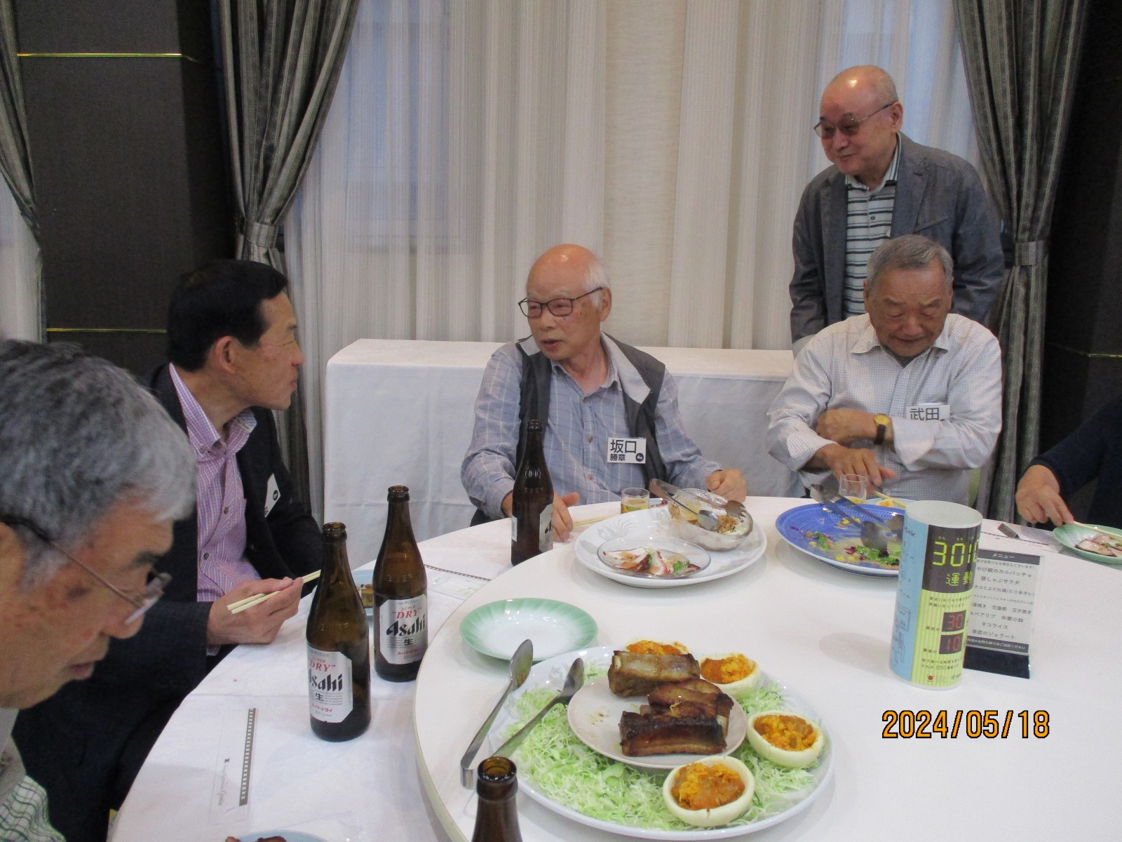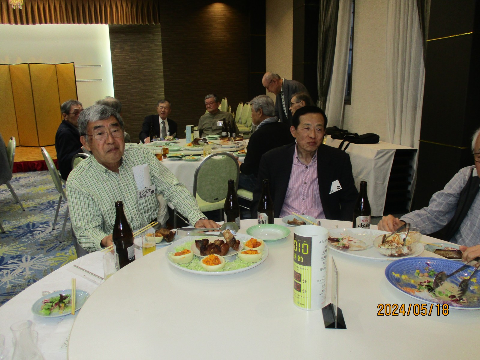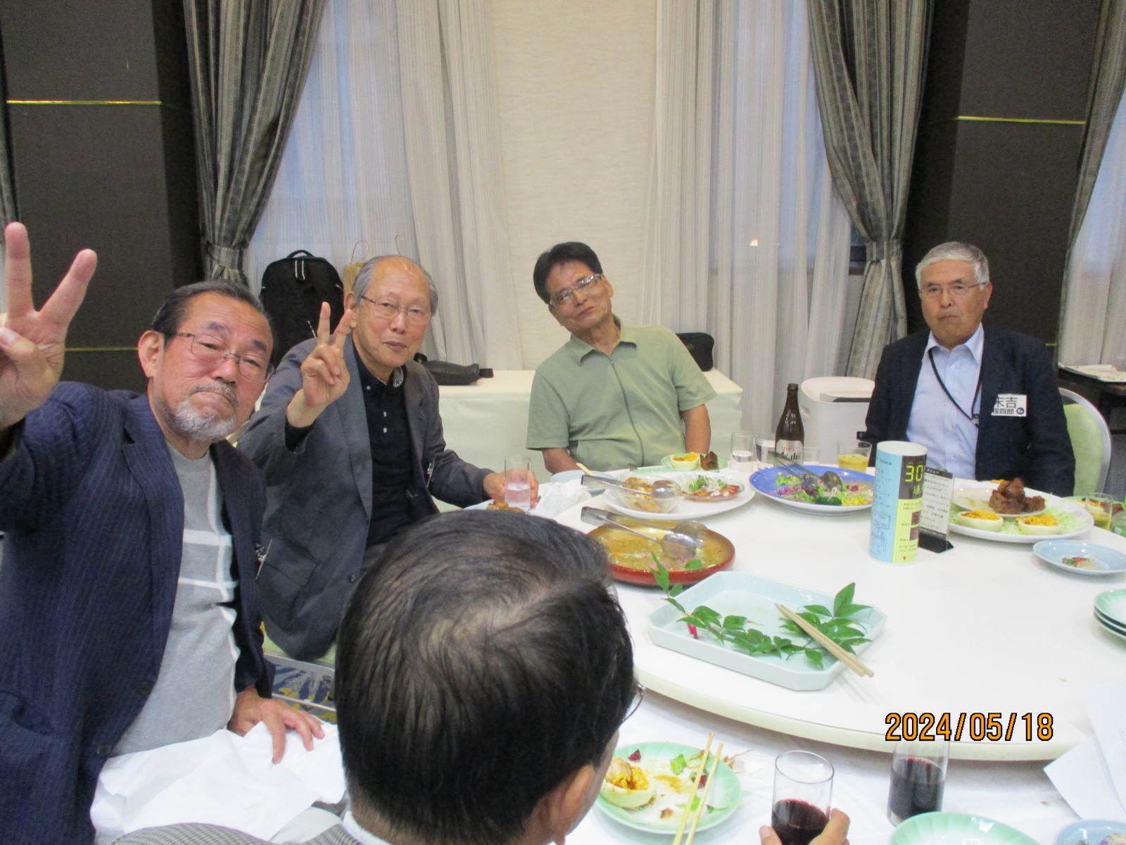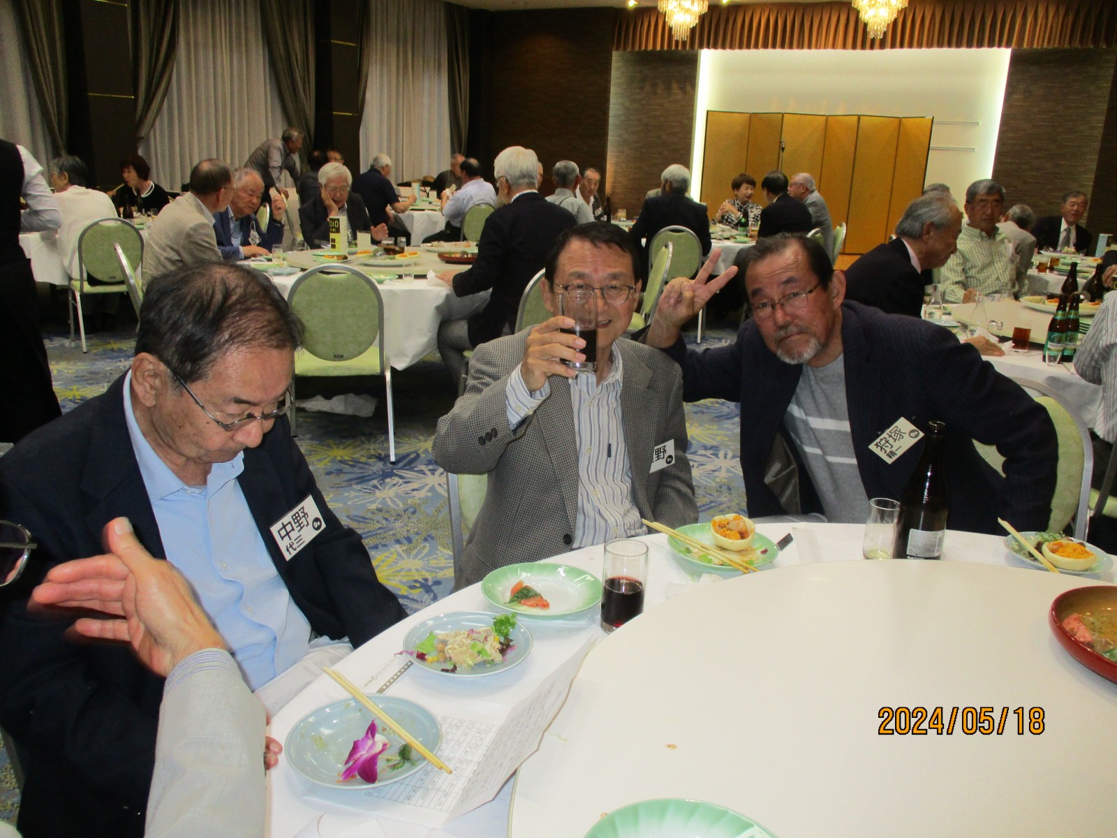 「喜寿を祝う会」が始まりました。開会では北里敏明副会長(10室)がちょっと長めのあいさつをし、大塚副会長が高らかに乾杯の音頭を取り宴がはじょまりました。久ぶりに会った友との話があちこちで弾みました。暫くの歓談の後、初参加者、久しぶりの参加者のスピーチがありましたが、ワイワイガヤガヤで話がよく聞き取れませんでした。その後、志柿学副会長のリードで第2応援歌、校歌斉唱を全員で大きな声で歌いました。故廣島正君(10室)の後任の百井正治君(8室)が”げんこつ„の音頭を取り全員で「げんこつ、げんこつ、げんげんこつこつ」と何度も両腕を突き上げました。最後は吉本和子副会長(4室)が閉会で「また来年もお会いしましょう。」と締めくくって終わりました。事務局・辰巳(写真をクリックすると大きくなります)